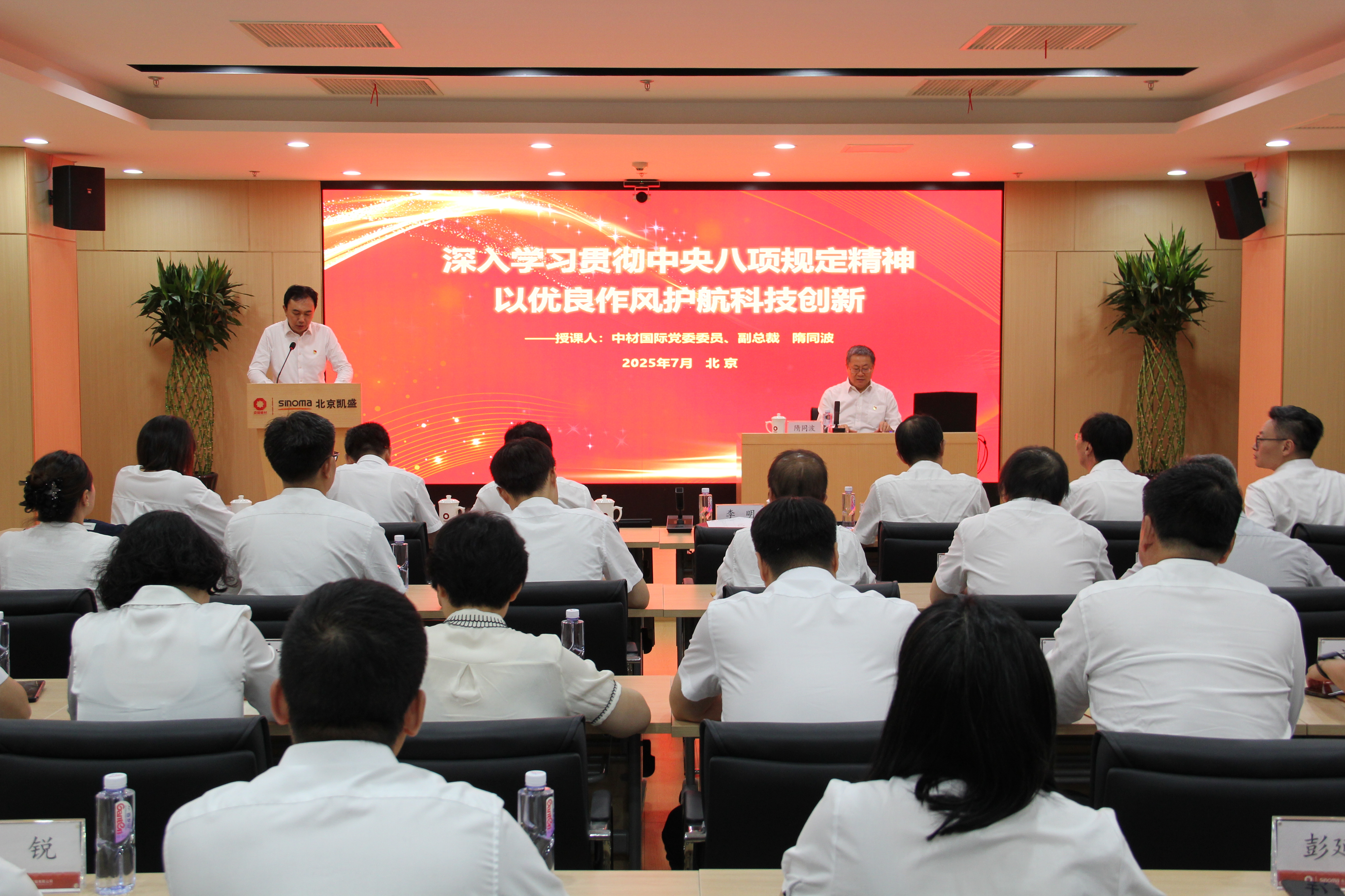 隋同波紧紧围绕深入学习贯彻中央八项规定精神,从以史为鉴明方向,在百年党史中汲取作风建设智慧力量;以学铸魂强根基,运用好中央八项规定精神的经验和成效;以案为鉴明得失,准确把握当前贯彻落实中央八项规定精神存在的突出问题;以行践知抓落实,纵深推进全面从严管党治企四个方面进行了深入解读。他指出,要以进一步加强作风建设为抓手,根植北京凯盛科技创新底蕴,大力弘扬科学家精神、工匠精神;要以贯彻落实中央八项规定精神为载体,鼓励科技工作者践行习总书记指示要求“把论文写在祖国大地上,把成果用在实现现代化伟大事业中”,推动提升科技创新效能;要坚持“科技赋能一线”价值创造理念,秉承“科技+服务+产业”发展思路,充分利用中材国际内部科研资源,不断拓展新的国际化和多元化业务领域,进一步增强企业核心竞争力。他强调,要紧密围绕国家战略需求、集团发展目标和中材国际主责主业,更大范围、更高层次、更深程度融入国家、集团和中材国际创新体系,谋划既适合北京凯盛长期发展战略,又具有行业引领性的“十五五”规划,赢得优势、赢得主动、赢得未来。